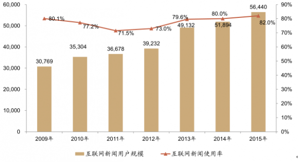 截止 2015 年 12 月我國通過互聯網獲取新聞信息的用戶數已經達到 5.64 億。隨著我國互聯網行業快速發展,互聯網用戶規模迅速擴大,瀏覽網絡新聞的用戶數量也隨之增長,網民逐漸養成通過網絡獲取新聞信息的習慣,2015 年,我國網民互聯網新聞的使用率達到 82.0%,僅次于即時通訊和搜索引擎,排在各類互聯網應用使用率的第三位。