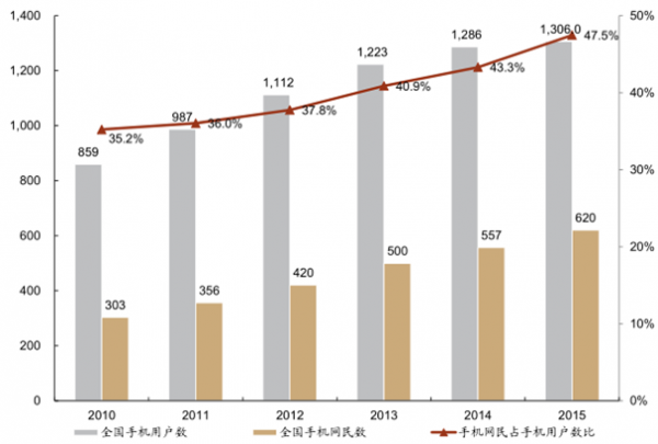 截至 2015 年末,我國手機用戶數達到 13.06 億,2010-2015 年間復合增長率為 8.7%;截至 2015 年末,我國手機網民用戶數達到 6.20,較 2014 年增加 11.3%。2010 年底,手機網民用戶數占手機用戶數比例為 35.2%,2015 年該比例已增至 47.5%。