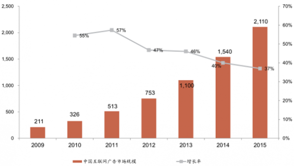 2015 年中國互聯網廣告市場規模突破 2,100 億元,同比增長約37%,超過電視廣告成為最大的廣告媒體,2009-2015 年間,我國互聯網廣告市場規模復合增長率高達 46.8%。