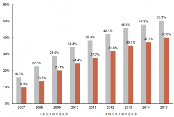 2015 年我國互聯網普及率達 50.3%,較上年提高 2.4 個百分點。2015 年四川省互聯網普及率較上年底提升 2.8 個百分點,達到 40.0%,但與全國互聯網普及率相比,仍存在一定差距,未來增長空間較大。