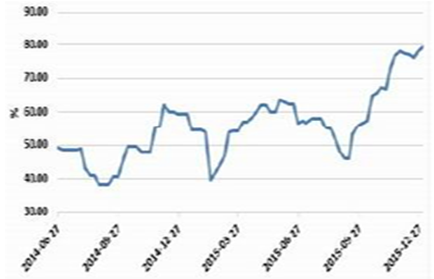 2015 年度,玉米淀粉行業開工率在 10 月份之前一直整體處理偏低的位置,10 月份之后隨著政府補貼政策以及原材料價格的走低,深加工企業盈利狀況有所改善,開工率回升至年內高位 80%附近。