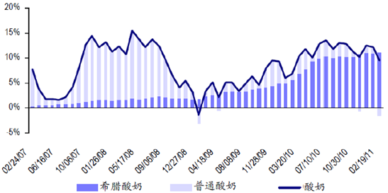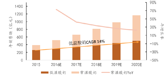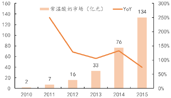 在經過初始的產品宣傳和消費者培養階段后,常溫酸奶進入高速成長期,2010-2014 每年都以超過100%的增速成長。2015 年增速略微放緩至2 位數,但也首次突破了百億大關。