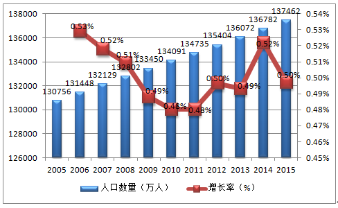 2005-2015年中國人口總數量及增速統(tǒng)計