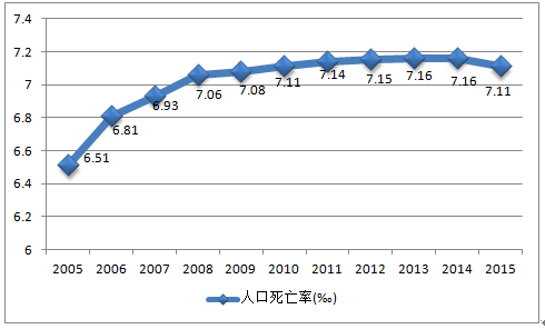 2005-2015年中國人口死亡率變化趨勢圖