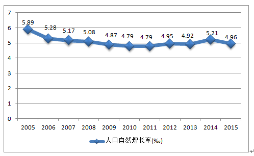 2005-2015年中國人口自然增長率變化趨勢圖