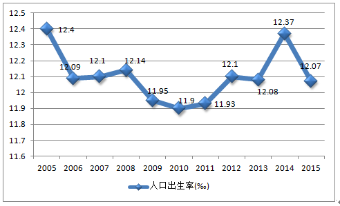 2005-2015年中國人口出生率變化趨勢圖