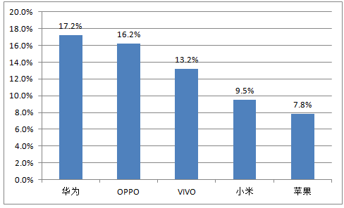 2016年第2季度,中國智能手機出貨量達到1.11億部,華為在中國市場以1910萬部的出貨量占據(jù)國內市場最大份額;其次為OPPO和vivo,出貨量分別為1800萬部、1470萬部;而小米在中國市場的出貨量降到1050萬部,市場占有率降到9.5%,位列第4;同樣變化較大的還有蘋果,2015年第2季度蘋果手機在中國市場以1260的出貨量占有第三的市場份額,2016年的第2季度則只排位第5。
