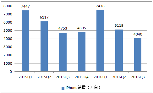 2015-2016年各季度蘋果iPhone銷量