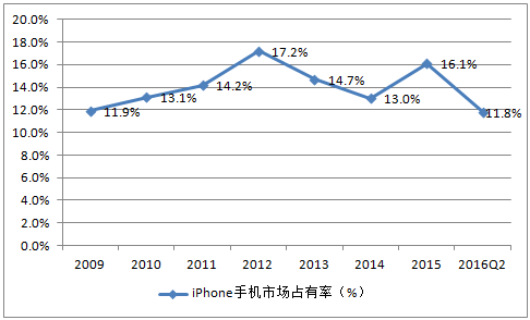 2009-2016年蘋果iPhone全球市場占有率