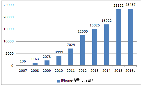 2007-2016年蘋果iPhone銷量趨勢圖