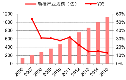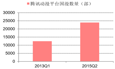 數據顯示,2015 年 我國互聯網和手機網民已經雙雙突破 6 億,互聯網及智能手機的普及革新了動漫發行渠道,以互聯網為主的新 媒體動漫平臺也正在崛起,渠道變革下壓抑的用戶需求開始爆發。(2)用戶層面來看:代際變遷觸發動漫產業 消費需求;90 后飽受二次元文化影響,隨著這批人群消費能力的逐漸提升,動漫產業迎來變現轉折點。(3)產 業層面來看:動漫行業的證券化是下半年可以預見的發展趨勢,增量資本加速進入動漫產業,動漫大 IP 時代即 將到來。天時地理人和之下,我國騰訊動漫、有妖氣等各類動漫新媒體迎來發展大時代,騰訊動漫的國漫數量 從 2013 年一季度的 1.2 萬余部迅速上升到 2015 年二季度的 2.4 萬余部,年增幅度超過 40%。