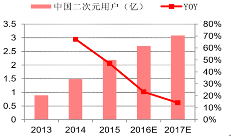 2015 年我國二次元用戶達到 2.2 億人,預計至 2017 年將超過 3 億人;而二次元用戶中的游戲玩家占比達到 74%,屬于游戲屬性很強的一類 群體,是手游領域內一片空間很大的市場。根據易觀智庫的數據,以動漫為 IP 的 IP 類手游占 18%,手游已成 為動漫變現的重要渠道,隨著國漫的興起,國漫在手游中也會扮演越來越重要的角色。