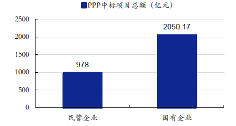 民營企業相較國企中標數量多,總投資額較小。根據我們統計,上市建筑企業中民營企業公告中標PPP 項目60 個,國有企業為32 個;中標金額方面,民營企業合計中標金額978億元,國有企業則為2050 億元。單體項目中標金額 ,國有企業為64 億元,顯著高于民企的16 億元。