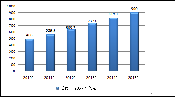 2015年我國減肥產業市場規模達到了900億元,同比2014年的819.1億元增長了9.9%,近幾年我國減肥產業市場規模情況如下圖所示: