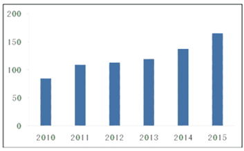 2010-2015年中國血液制品市場規(guī)模(單位:億元)