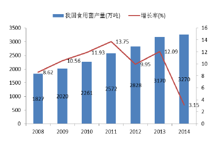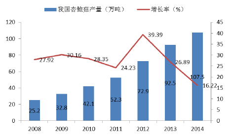 我國食用菌總體市場穩步增長,且規模巨大。盡管受到宏觀經濟下行的影響,食用菌總體規模增速下降,2014年我國食用菌產量達到3270萬噸。其中,杏鮑菇作為食用菌細分行業,行業發展勢頭強勁,雖不及香菇、平菇、金針菇等產量基數大,但杏鮑菇產量增速保持在較高的水平,2008年至2014年年增長率達到了27.59%。