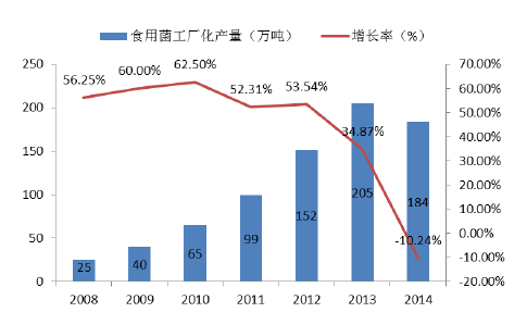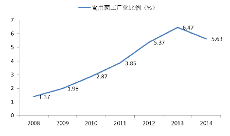隨著我國食用菌消費需求的不斷上升,食用菌工廠化也蓬勃發展。經過多年的市場培育,目前我國食用菌工廠化的生產技術和生產模式日趨完善,工廠化生產不斷專業化,分工不斷精細化,并且帶動食用菌生產相關領域技術的深入和提升,促進生產技術和產能的大幅提升。2014年我國食用菌工廠化產品日產量達到6134噸,年產量達到184萬噸,食用菌工廠化比例由2008年的1.37%上升至2014年的5.63%。但是,目前我國的食用菌工廠化生產比例較低,相比于國外發達國家及地區90%的水平差距較大,工廠化尚有很大的發展空間。根據目前食用菌工廠化生產行業的發展特點和市場規模趨勢來分析,食用菌行業正處于成長期,預計未來將會是發展的黃金時期。