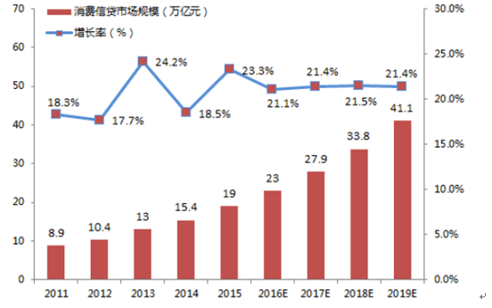 中國消費信貸余額從2015年-2019年預計保持CACR21%以上的增長