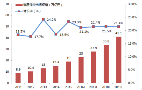 中國消費信貸余額從2015年-2019年預(yù)計保持CACR21%以上的增長