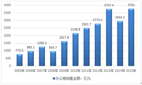 2014年我國辦公樓銷售面積達到2497.87萬平方米,較上年同期下降13.4%; 2015年我國辦公樓銷售面積達到2912萬平方米。