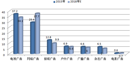 2015年全球電視廣告和網路廣告份額占比分別為37.2%、29.4%,而到2018年,電視廣告和網路廣告份額占比會分別變為34.1%、37.7%,同樣變化較大的還有報紙廣告,份額占比會由2015年的12.8%降為2018年的9.9%。