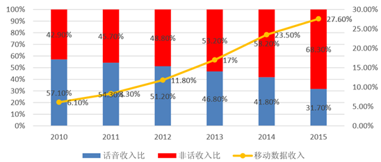 由于移動互聯網迅速發展,流量消費快速增加以及 OTT 廠商的通訊應用對語音通 話的替代作用,使得近幾年來語音業務所占運營商整體營收比例不斷下降,而數據業務逐漸成為運營商重要的收入來源。據工信部資料, 2015年非話收入占比已達68.3%, 已超越話音收入成為收入第一來源;其中,移動數據收入占比從 2010 年 6.1%增加到 2015年27.6%,2016年上半年移動數據收入占比已提升到34%。