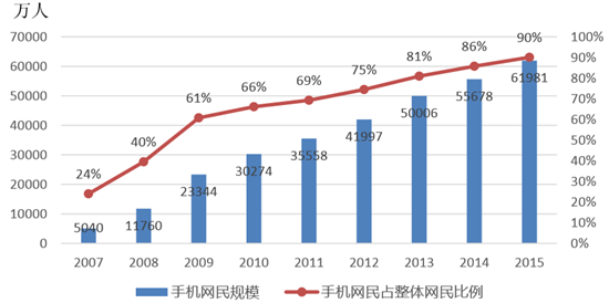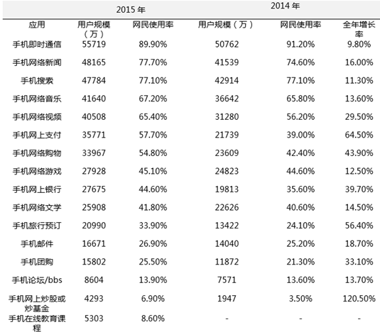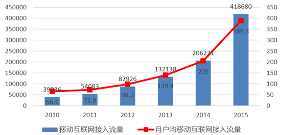 同時,相關移動應用開始全面進入日常生活場景,從原先的工具時代進入消費時代 并逐漸邁入服務時代。衣食住行、教育醫療、娛樂理財等應用大量出現,競爭也愈發激烈。移動網絡的建設與移動互聯網應用的快速推廣促使流量使用激增,據工信部統計,2015年移動接入流量消費達41.87億G,同比增長103%;月戶均移動接入流量(DOU) 達到389.3M,同比增長89.9%。