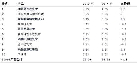 2013—2014年,我國皮膚病用藥前十大產(chǎn)品銷售額份額大約為30%,總體水平略有下降。其中,糠酸莫米松乳膏銷售額連續(xù)兩年保持最高,且上升趨勢明顯。除此之外,復(fù)方酮康唑發(fā)用洗劑和硝酸益康唑噴劑增長趨勢明顯。