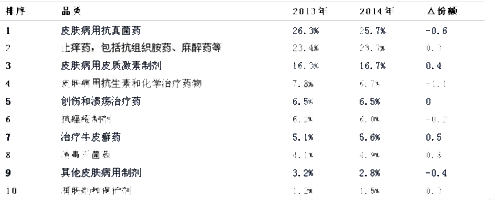 2013年和2014年,我國皮膚病用藥前十大廠家銷售額份額分別為34.4%和35.1%,總體水平略有增加。從增長情況來看,滇紅藥業(yè)集團(tuán)股份有限公司增長最為明顯,而中美天津史克制藥有限公司降幅最大。