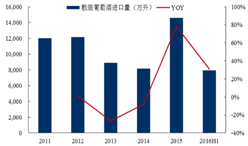 散裝葡萄酒進口量及增速