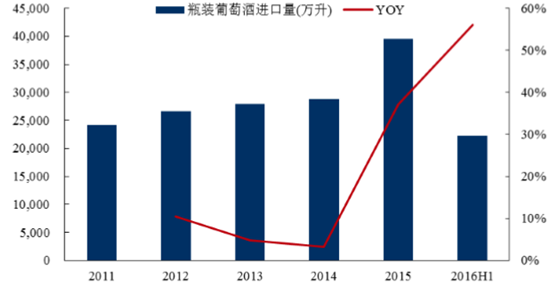 瓶裝葡萄酒進口量及增速