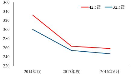 2014-2016年全國散裝普通水泥價格(單位:元)