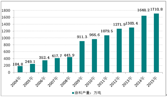 自1915 年上海開林油漆廠創(chuàng)建以來,中國的涂料工業(yè)已有近百年的發(fā)展歷史。截至2010 年,我國已經(jīng)形成了受眾包括建筑、機械、化工、輕工、建材、交通等行業(yè)在內(nèi)的的廣大涂料行業(yè)市場。2014年,我國涂料總產(chǎn)量1648.19萬噸,2015年,我國涂料總產(chǎn)量達1710.82萬噸,新增62.63萬噸,同比增長3.8%。