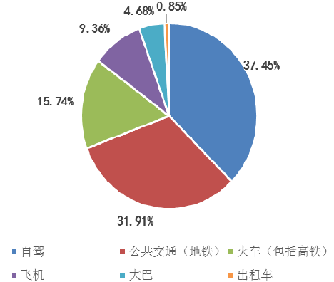2、交通方式以自駕居首(37.45%),公共交通(31.91%)其次,兩種方式占到所有出行的將近七成?紤]到上海的地理位臵與交通環境,周邊游中自駕游的比例已經明顯提升,在經濟發達地區甚至有超過公共交通的趨勢(由于迪士尼的消費水平較高,高收入客戶群體的比例顯著高于一般景點。因此,行業平均而言自駕游比例低于公共交通,偏遠地區甚至低于旅游大巴的比例)。同時,高鐵成為了江浙地區沒有私家車客戶的首選周邊游交通工具,達到15.74%,與我們對于國內高鐵效應的邏輯假設相吻合。
