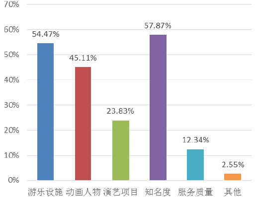 從園區吸引力角度反映,品牌知名度和游樂設施是消費者最認可的兩個要素,要高于動畫人物(IP 內容)在國內的認可程度。因此,要實現全客層覆蓋的主題公園運營商在長期注重內容建設投入的同時,關注品牌營銷和游樂設施配臵能夠在短期內抓住消費者需求。