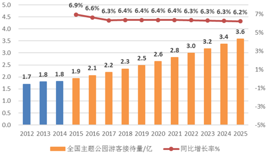我國人均出游頻次不及美國的一半,以中國的人口基數和經濟體量,整個國內外旅游業市場仍將有10 倍發展空間。結合宏觀和供需兩端綜合考慮,國內主題公園的市場規模受到國內人均GDP 和國內旅游總人次的影響。首先根據人均GDP 和國內旅游總人次進行回歸分析,預測出2020 年和2025 年相應的國內旅游總人次可達到62.15 億和82.79 億。再根據過往人均消費水平與主題公園行業游客接待量,同時考慮到行業集中度上升對于增長的正效應,預測出2020 年和2025 年相應的全國主題公園接待量分別達到2.71 億和3.69 億人次,年化增速達6.05%。