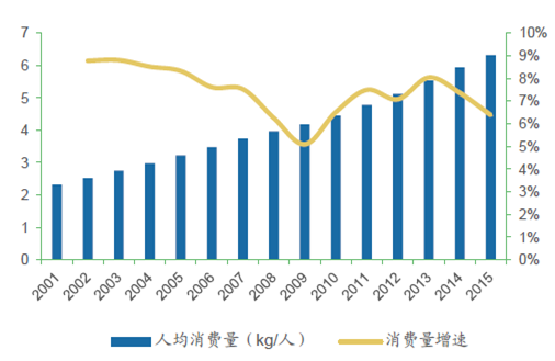 2001-2015年中國(guó)面包糕點(diǎn)行業(yè)人均消費(fèi)量及增速