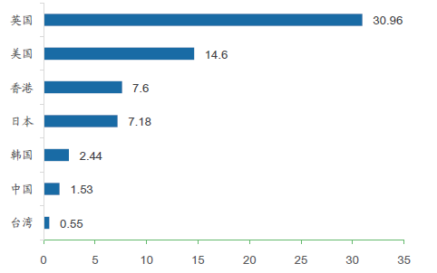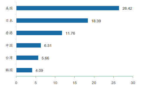 中國(guó)的面包糕點(diǎn)銷售額居亞洲首位(百萬(wàn))