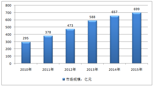 2015年我國(guó)糕點(diǎn)行業(yè)銷售市場(chǎng)規(guī)模約699億元,同比2014年的657億元增長(zhǎng)了6.39%,近幾年我國(guó)糕點(diǎn)行業(yè)銷售市場(chǎng)規(guī)模情況如下圖所示: