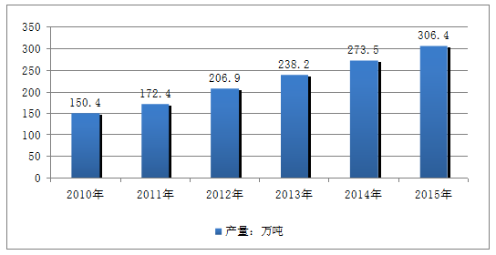 2015年我國(guó)糕點(diǎn)行業(yè)產(chǎn)量約306.4萬(wàn)噸,同比2014年的273.5萬(wàn)噸增長(zhǎng)了12.03%,近幾年我國(guó)糕點(diǎn)行業(yè)產(chǎn)量情況如下圖所示: