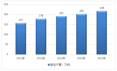 2014年我國(guó)面包產(chǎn)量為202萬(wàn)噸,2015年我國(guó)面包產(chǎn)量增長(zhǎng)至218萬(wàn)噸,產(chǎn)量同比增長(zhǎng)7.9%。