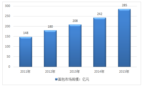 2014年我國(guó)面包市場(chǎng)規(guī)模為242億元,2015年我國(guó)面包市場(chǎng)規(guī)模達(dá)到285億元,規(guī)模同比增長(zhǎng)17.8%。