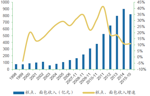 1998-2015年中國(guó)面包糕點(diǎn)收入及增速