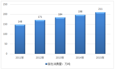 我國(guó)居民生活水平、消費(fèi)能力不斷提高,也促進(jìn)了面包市場(chǎng)的發(fā)展,帶動(dòng)了面包行業(yè)產(chǎn)能的不斷增加。2015年我國(guó)面包消費(fèi)量為211萬(wàn)噸,消費(fèi)量同比增長(zhǎng)6.6%。