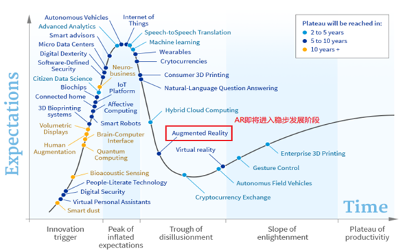結合全行業的技術積累與資本運作情況,我們認為,當前市場已將大量不成熟的 AR 技 術和冗余服務淘汰,業界專家和投資者對 AR 的適用范圍有了更實際、清晰的認識,商業模 式框架已相對成熟。AR 即將迎來 5 年期穩步發展階段,并在未來 5-10 年達到真正意義上的 行業高峰。