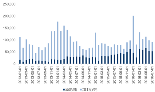 中國從海外進口的奶制品分兩種,一種為原奶,另外一種為加工奶,且進口主要以加 工奶為主。其中,加工奶的主要進口國為新西蘭,2016 年 7 月占比 79%;原奶的主要進 口國為德國、法國、新西蘭、澳大利亞,2016 年 7 月占比 84%,相同區間,單獨統計歐 盟占比 74%。所以我國奶價主要受新西蘭和歐盟奶制品價格影響。