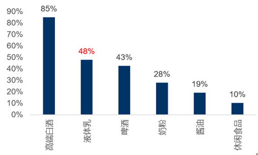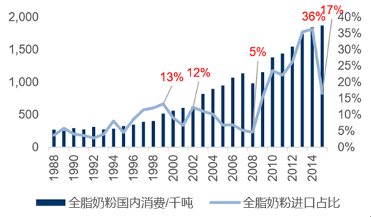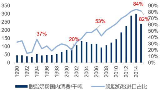 2015 年進口奶制品消費占國內奶制品消費的 6.62%。從進口產品來看,進口全脂奶粉 消費占國內全脂奶粉消費的 17%,進口脫脂奶粉消費占國內脫脂奶粉消費的 82%,進口液 態奶消費占國內液態奶消費的 1%。