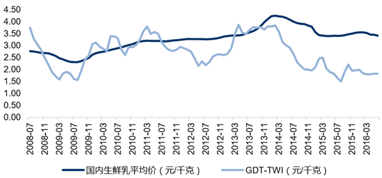 核心提示:從 2008 年至今,除了 2009-2011 以及 2013 年國際原奶價格高于國內原奶價格,其 余時間國際原奶價格均低于國內原奶價格,且目前價差處于極值附近。最新 2016 年 8 月 24 日國內主產區生鮮乳價格 3.39 元/千克,從 2008 年至今,除了 2009-2011 以及 2013 年國際原奶價格高于國內原奶價格,其 余時間國際原奶價格均低于國內原奶價格,且目前價差處于極值附近。最新 2016 年 8 月 24 日國內主產區生鮮乳價格 3.39 元/千克,截止 2016 年 6 月 29 日,國內生鮮乳價格 3.42 元/千克,GDT 原奶價格折合人民幣 1.83 元/千克。其中,新西蘭原奶價格 1.5 元/千克, 澳大利亞原奶價格 2.5 元/千克,德國原奶價格 1.9 元/千克,美國 2.2 元/千克。
