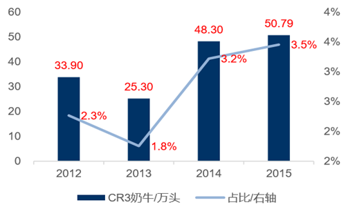 截止 2016 年 6 月底現代牧業畜群規模 22.493 萬頭,成乳牛 11.46 萬頭,成乳牛占比 52%,2013-2015 年成乳牛占比 49%-53%之間;截止 2016 年 3 月底輝山乳業畜群規模 20.89 萬頭,成乳牛 9.63 萬頭,成乳牛占比 48%,2013-2015 年成乳牛占比在 41%-45% 之間。