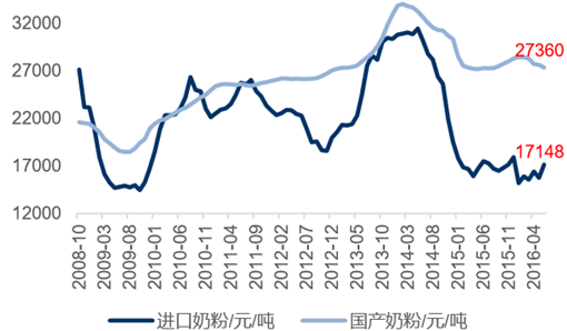 海外進口奶粉 2016 年 6 月到岸價格 1.7 萬元/噸,與國內奶 粉 2.7 萬元/噸相比低 38%,相差約 1 萬元/噸。2008-2016 年進口鮮奶到岸價格與國內主產區的原奶價差在縮窄,但是進口鮮奶價格截止 2016 年 6 月仍高出國內主產區生鮮乳價 格 3445 元/噸。
